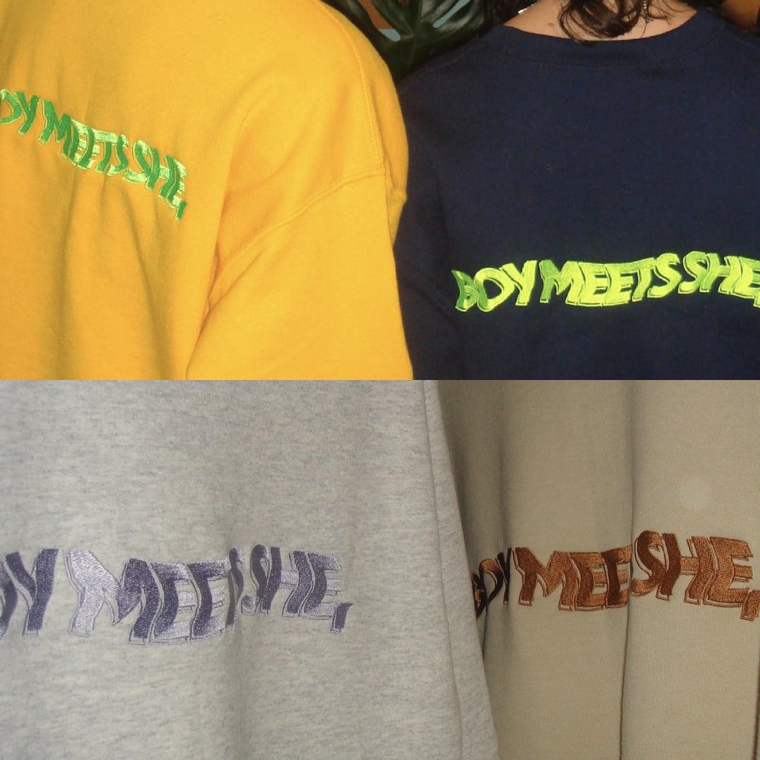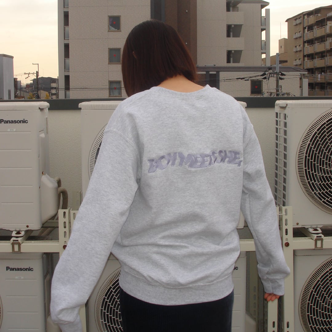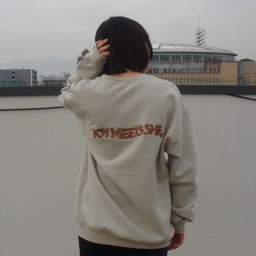 オーバーサイズのアメリカンスウェットの背面に「BOY MEETS SHE, 」のロゴ刺繍を施した一着。裏起毛なので寒い時期の一着にぴったりです。